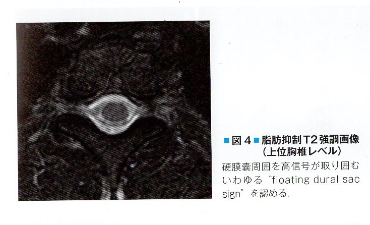 今回注目を浴びているMRIについて 本文20頁4行-10行目 MRIでは脂肪抑制T2強調画像と造影T1強調画像が必要である。それぞれ矢状断像と水平断像の2方向撮影が望ましい、矢状断像は全体像の把握や漏出部位範囲の把握に役立つ、水平断像が特に重要で、全脊椎を脂肪抑制T2強調画像でできるだけ密に撮影する 硬膜外脂肪と区別するために、脂肪抑制法を用いたT2強調画像にするか同一部位のT1強調画像を撮像しておく。 硬膜外に水貯留を見たら、静脈と区別するために造影後のT1強調画像を追加する.T2強調画像で水信号を示し、静脈が除外できれば漏出した脳脊髄液と診断できる。↗右上の図 典型的な脳脊髄液漏出症では、脊柱管内の硬膜外に水貯留が認められ、硬膜嚢があたかも水に浮いているように見える floating dural sac sign (FDSS)である。診断的価値が高い この図4のような典型的なFDSSだけでなく微量なFDSS サインも診断的価値が高い画像と承認された。2019.7.6厚労省でその件で記者会見があり微量なFDSS サイン画像5例がメディアに配られた、残念な事にこの5例の画像は指針本には記載されなかったためここに公開するに至った 右↗画像 |